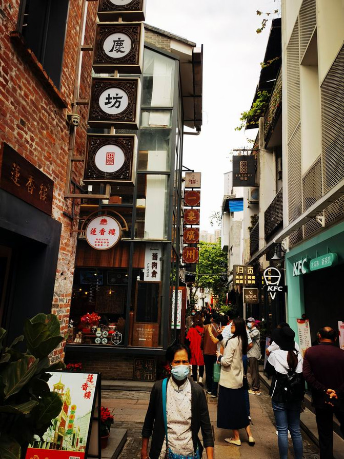 "Yongqing Fang" está adyacente a la superficie de arena, se dice que es el primer proyecto de reconstrucción de la ciudad vieja de Guangzhou realizado por Vanke, una empresa dirigida por el gobierno. Cuando llegamos, la entrada de Yongqing Fang todavía estaba siendo remodelada.