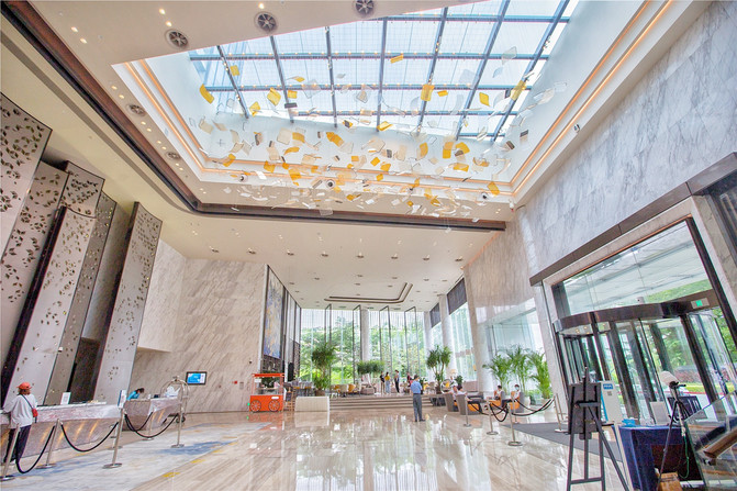 El vestíbulo del Sheraton Guangzhou Nansha Yuexiu Hotel tiene muchos puntos destacados, y el diseño está lleno de la cultura del pueblo acuático Nansha. La recepción del hotel está hecha de piedra con un rico sentido de diseño, como si fuera un velero que velea.