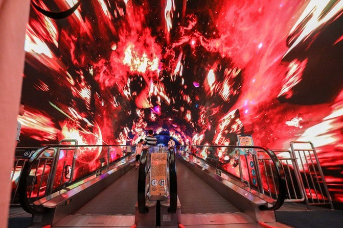Para entrar en el Jungka Polar Ocean World, primero pasará por una larga escalera mecánica. Aquí, la escalera mecánica no es solo una escalera mecánica. En la cúpula de la escalera mecánica, hay una impresionante pantalla LED panorámica. La pantalla LED panorámica muestra el proceso de la Tierra desde el Big Bang hasta el nacimiento de los océanos, que es muy magnífico.