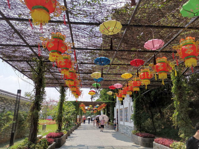 Entra en la puerta del lugar escénico, a lo largo de una avenida de cemento hacia el oeste, el lugar escénico construido en el lado del albergue de una especie de planta de escalada sin nombre subió por el cobertizo, colgando linternas rojas, amarillas, verdes y rosadas, y colgando de un bigote de raíz, es recortado artificialmente en dos lados bastante característicos de la forma de la casa baja, media y alta, muy novedoso. El césped verde y el algodón están floreciendo. Al adentro, se puede ver el complejo arquitectónico de estilo tradicional de Lingnan, la puerta estrecha o la casa alta gris construida a lo largo del agua, o las casas de pared alta de la oreja de la boca, en el lado norte de la carretera se construyó el Templo del Primer Ministro Bao Cheng, el Palacio de Tianhou, el Templo de Douhuangyuanjun, etc. A lo largo del camino hacia el norte, frente a la izquierda es un lago Hong, frente a la aldea.