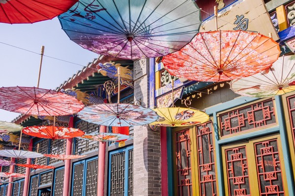 Todo tipo de paraguas de papel de colores y patrones colgan al revés en las calles del centro.