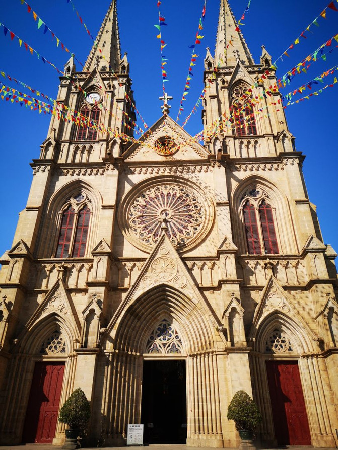 Las ventanas de rosas redondas de 7 metros de diámetro en el frente, el este y el oeste están incrustadas con vidrio de rojo oscuro, azul oscuro y amarillo púrpura, que no solo evita la luz brillante al aire libre, sino que también muestra fragmentos de historias bíblicas a través de luces y sombras.La parte superior del interior es imponente, y las lámparas de cristal colgantes son hermosas.