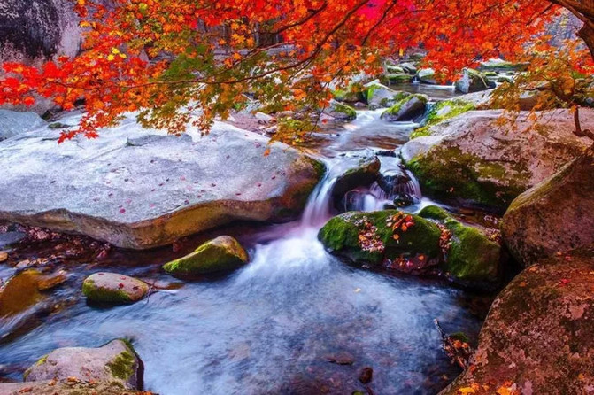 Entre las estribaciones de las montañas, la brisa de otoño sopla ligeramente los arroyos de los bosques montañosos, una lluvia de otoño y un rocío temprano, causando que los colores de las montañas se vuelvan coloridos, como si los niños estuvieran haciendo graffiti.
