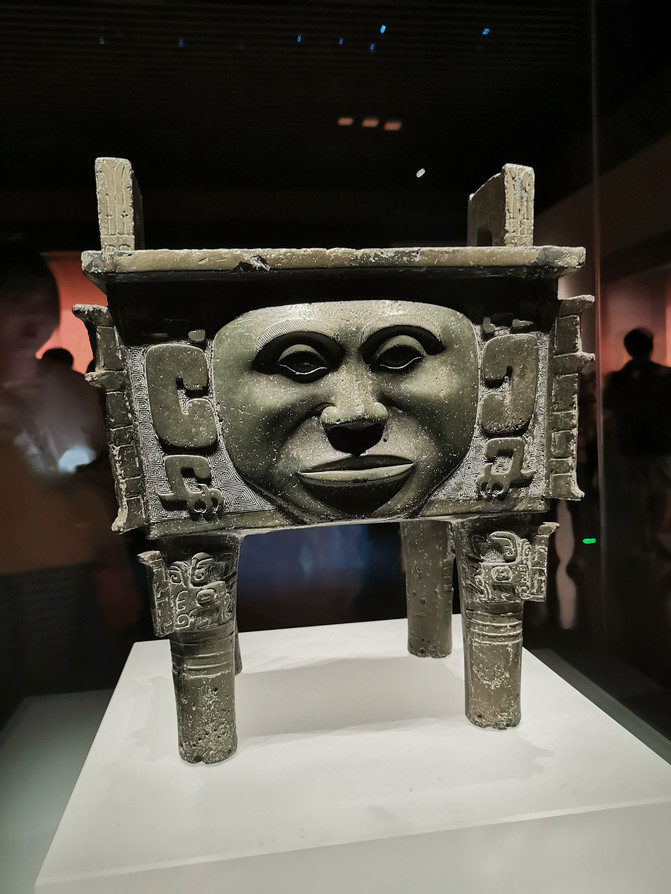 1, Dahe persona tatuaje facial Fang Ding. Los artefactos de la dinastía Shang tardía fueron desenterrados de color verde azulado, con una boca superior ligeramente más grande que la parte inferior. Lo más especial es que el cuerpo está decorado con una cara humana en medio relieve, rodeada de nubes y rayos, con dos garras en cada lado de la mandíbula.