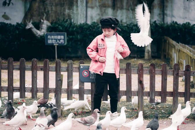 Yuan Bao favorito es puede alimentar palomas y pavos reales, comprar un paquete de lugares escénicos venta especial de alimento, rociar un poco, una paloma inmediatamente "olor y venir", cada vez más, a veces en el suelo, a veces volar, Yuan Bao está rodeado de palomas blancas y grises, me recuerda el río Ganges también está rodeado de palomas de los buenos tiempos.