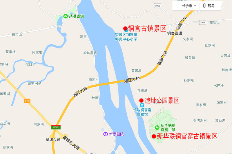 Saliendo de la antigua ciudad de Tongguan, llegue al recién completado punto escénico de la antigua ciudad de Tongguanyao de Xinhua Lian, que se encuentra en el extremo sur de los tres lugares escénicos, y también es el primer lugar escénico en llegar desde la dirección de la ciudad de Changsha. Su puerta norte está a aproximadamente 1 km del parque de ruinas, 5 km de la antigua ciudad de Tongguan y 25 km de la estación gubernamental del distrito de Kaifu de la línea 1 del metro de Changsha.
