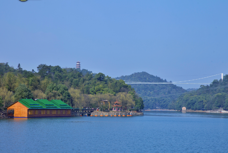 El puente de vidrio de gran altura del lago Shiyan cruza el lago Shiyan desde el pico芙蓉 del lago Shiyan y conecta la isla de monos del mar del sur en el corazón del lago. El puente es de 200 metros de largo, 2,5 metros de ancho y 100 metros de altura vertical, con una vista panorámica de 720 grados con vistas al lago Shiyan.