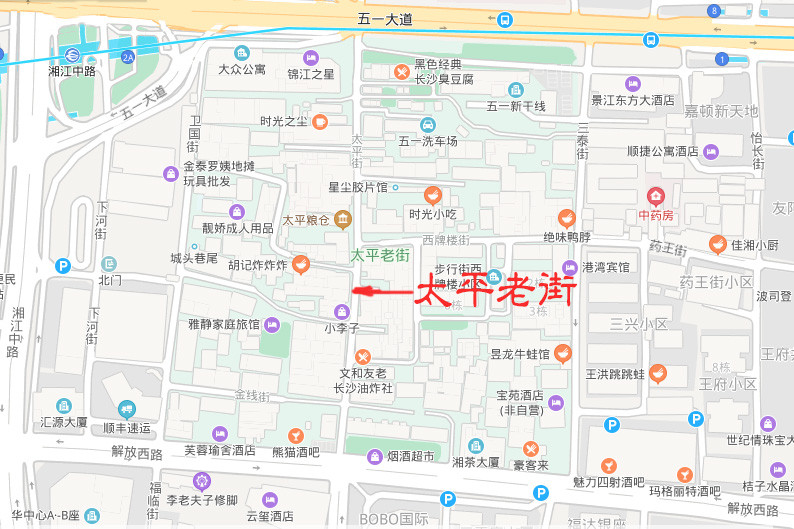 Changsha Taiping Old Street, ubicado en el centro de la ciudad, al norte de la avenida del 1 de mayo, al sur de Jiefang Road, al oeste de Weiguo Street, al este de Sanxing Street, Santai Street. Con Taiping Street como el centro, West Pailou Street, Majia Lane, Jinxian Street, Taifu y otras calles y callejones en forma de hueso de pescado se encuentran en ambos lados. La antigua residencia de Jia Yi, el antiguo sitio de la Sociedad de Sizheng, el antiguo sitio de la Asociación de Progreso Comunista de Hunan, Meifu Yangxing, Qian Yisheng Grano Decker, Banco de Agricultores, Li Sheng Salt y otros edificios claros de la noche, así como algunas instituciones culturales modernas, como Rong Baozhai, China Yindu, Sanyuan Tang y Taiping Li. Desde el comienzo de la fundación de Changsha en el período de los Reinos Combatientes, la calle Taiping Vieja se ha formado gradualmente, pero su patrón no ha cambiado mucho después de más de 2000 años. No tiene más de 7 metros de ancho y más de 370 metros de largo. Los pequeños azulejos El antiguo escenario de ópera vuela en ángulos y el pavimento de piedra de esmalte conecta la antigüedad y la modernidad. Los antiguos callejones giran, la vieja fachada tallada de dragones y fénix, el estilo antiguo aún existe. La calle Taiping es una de las calles mejor conservadas de la ciudad de Changsha, que es el epítome de la antigua ciudad de Changsha y testigo de la historia y las vicissitudes de la ciudad de Changsha.