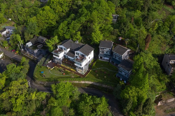 Desde el aire, se puede ver que hay cinco casas en el alojamiento residencial. El edificio principal en el extremo izquierdo es la recepción, el restaurante y otras áreas comunes. El medio es la habitación con vista a la montaña, y las tres cabañas en el extremo derecho son las habitaciones privadas de sopa en el jardín.