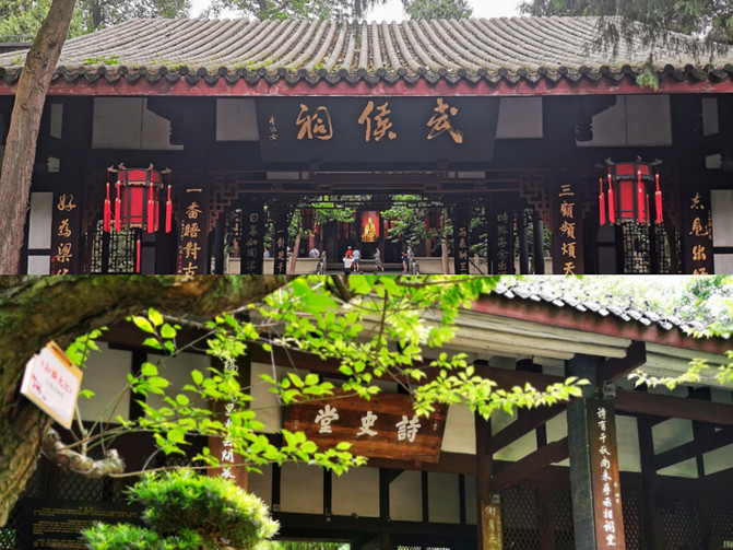 Du Fu Cottage está a solo tres kilómetros del Templo de Wuhou. Según la introducción, Du Fu es el visitante más visitante del Templo de Wuhou. Su "Siete Jueces" "El Primer Ministro": Dónde encontrar el salón ancestral del Primer Ministro, Jinguan fuera de la ciudad de Bo Sen Sen Sen. La hierba verde de la primavera, el hueco amarillo de las hojas septinales. Tres preocupaciones frecuentes con el plan del mundo, dos dinastías para abrir el corazón de los antiguos ministros. El maestro murió antes de ganar, y el héroe se llenó de lágrimas. Expresa la admiración de Du Fu por el talento y el carácter moral de Zhuge Liang y sus sentimientos por el fracaso de la carrera, que no solo tiene comentarios sobre la historia, sino también una referencia realista.