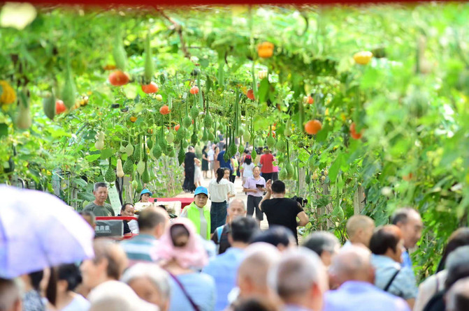 En un tranquilo verano, a orillas del río Sishui, miles de acres de jardín pastoral, olas azules; flores como brocado, melones y frutas fragan; patos, cerdos y peces, cosecha abundante a la vista. A las 8: 00 de la mañana, los invitados a través de la puerta de la recién completada base de educación laboral entraron en la avenida de educación laboral, recogieron turismo juntos, disfrutaron de la hermosa escena de la cosecha idílica, degustaron una gran variedad de calabazas y otros cultivos, y visitaron la nueva escena de la base de educación laboral en construcción.