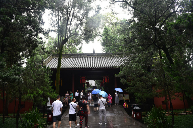 Entra en la puerta, desde la introducción a la izquierda de la puerta y el diagrama esquemático se puede ver, el Templo Wuhou se refleja en el cemento verde, todo el palacio se sienta de norte a sur, dispuesto en un eje central, todo el camino hacia adelante, veremos la puerta, la segunda puerta, el Salón Liu Bei, el pasillo, el Salón Zhuge Liang cinco pisos, el oeste es el cementerio Liu Bei. Para decir la verdad, a lo largo de este camino de ladrillos verdes, el cerebro realmente olvidará las voces ruidosas, olvidará a los socios circundantes, flash en la mente es que escuchó desde la infancia de la gran "Jardín de Peachos" "San Gu Yan" y así sucesivamente estas historias familiares, todos son aquellos que han pasado por los años, todavía en la historia de los personajes brillantes arrojados.