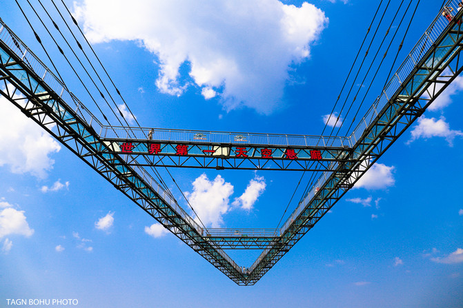 Después de experimentar la emoción del columpio, el puente colgante de vidrio definitivamente no se debe perder. Sobre 300 metros de altura, en la cima de un acantilado, un puente colgante de vidrio de 150 metros de largo forma un pasaje aéreo que asusta a la gente hasta llorar. Este es un vidrio totalmente transparente. Cuando no caminas, te ves en el pie del puente colgante, es un poco suave. La construcción de vidrio totalmente transparente puede permitir a las personas ver el acantilado debajo de sus pies sin ningún rincón muerto. Dos pasos saben lo emocionante que es, pero a menudo es el miedo psicológico que lleva a no caminar más allá. Y la mano del puente colgante de vidrio está rodeada por una red de grandes agujeros. Por un lado, puedes disfrutar de la belleza del paisaje cárstico diferente, y por el otro lado, trata de caminar hacia adelante. Con los turistas detrás, todo el puente vacila. Junto con el impacto visual debajo de los pies, el grado de estímulo se juega al extremo para suavizar los pies.