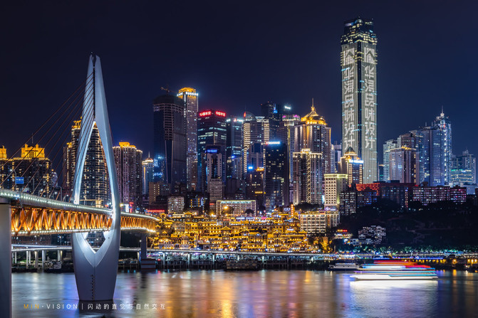Desde el puente se ve la Plaza Raffles de Chongqing diseñada por el arquitecto de renombre mundial Moshe Safdi y el ajetreado terminal de cruceros Chaotianmen. El muelle de Chaotianmen es la intersección entre el río Jialing y el río Yangtze. Es el muelle de agua más grande de Chongqing. Por la noche, tomar un barco turístico para hacer un tour nocturno de los dos ríos también es un buen punto para fotografiar la escena nocturna de Chongqing.