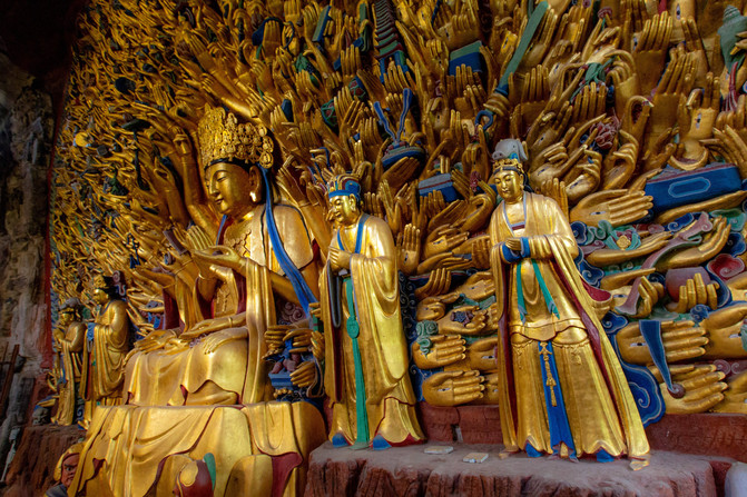 En las cuevas de Sichuan y Chongqing, hay muchas imágenes bien conservadas de Guanyin de las mil manos. Las imágenes de Guanyin de las mil manos talladas en piedra en Wofogou, Qianfuzhai en Anyue, Luohan Cave en Fushun, Chonglong Mountain en Zizhong, Qianfuyan en Jiajiang y otros lugares son obras excelentes, pero no son tan grandes como la escala, la mano de obra y la influencia de largo alcance de Dazu Baoding.