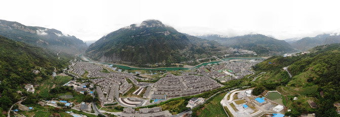 El comienzo de este libro de viajes es la antigua ciudad de Yangjiao. La antigua ciudad tenía el peligro oculto de deslizamientos de roca, por lo que todo se trasladó a este lugar ahora. Bajo la perspectiva de la fotografía aérea, las casas residenciales de la antigua ciudad de Yangjiao se distribuyen ordenadamente, como la forma de un cuerno de oveja.