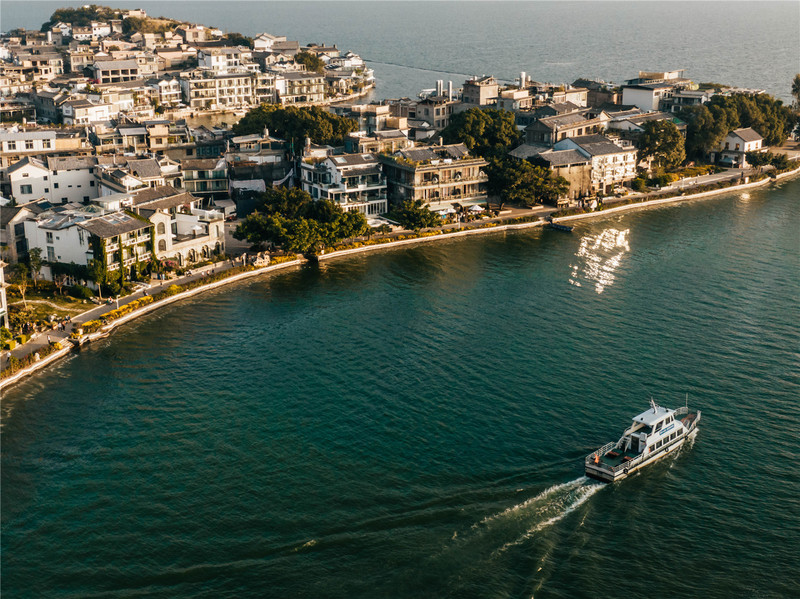 Mirando el lago Erhai frente a mí, por un momento parecía que el mar y el cielo eran de un solo color, como la ilusión de integrarse en uno. Hay barcos de cruceros que se pueden visitar en la isla, de ida y vuelta, los barcos surgen en el mar.