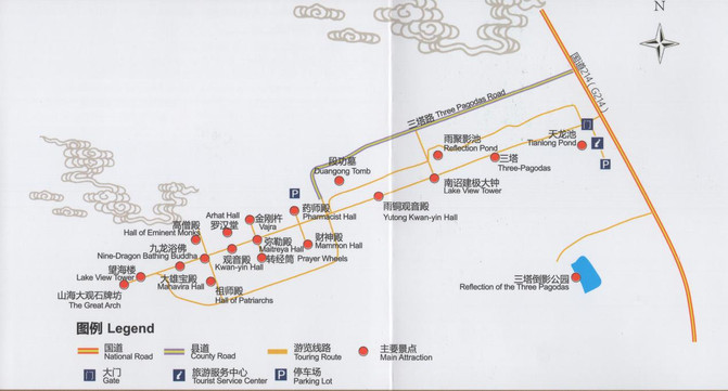 Los puntos de vista también incluyen el Gran Reloj Nanzhao Jianji y el Salón de Guanyin de Yuzhong.