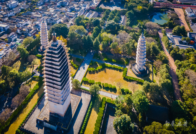 Las tres torres del Templo Chongsheng son las torres originales, solo después de la reparación, ubicadas en la entrada del lugar escénico, particularmente llamativas, las tres torres consisten en una gran, dos pequeñas y tres pabellones, las personas locales lo llaman "Wenpen Tower", la investigación textual de los materiales históricos fue construida en el período de Nanzhao persuadido por Fengyou, es un testimonio de la historia de Dali. El estilo arquitectónico es un poco diferente de la mayoría de los templos de Yunnan, pero es muy similar a la Pagoda del Ganso Grande de Xi 'an, con la estructura de la pendiente de bloqueo de la colina.