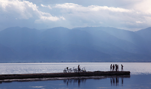 Las carreteras alrededor del lago Erhai son de nueva construcción.Si se ponen en un día soleado, la carretera definitivamente emite un mal olor. Ah, de vez en cuando se puede ver a varios "compañeros", completamente equipados, paseando en bicicleta por su lado. En ellos veo una obsesión acompañada de soledad, que interpreta que el turismo también es un vagabundo del corazón. El mar de algas en el borde del lago Erhai, medio expuesto hay algunas ruedas de arbustos viejos sin hojas, tampoco sé la edad, se ve muy viejo, desvanecido, seco. Años y años, no sé cuántas personas han visto y han sido testigos de todo tipo de cambios aquí. La rueda no se detuvo, vio las tres torres en la distancia, pero montó el viejo medio día antes de llegar a la puerta. Recuerdo una frase que leí en Dali. Mirando las montañas corriendo a los caballos muertos, lo entiendo profundamente. Dudar considerando que el océano en el equipaje no es mucho, no entró. Tomé algunas fotos en la plaza al lado, compré una pequeña bolsa de fruta hawaiana y regresó a la ciudad antigua sin grandes demoras.