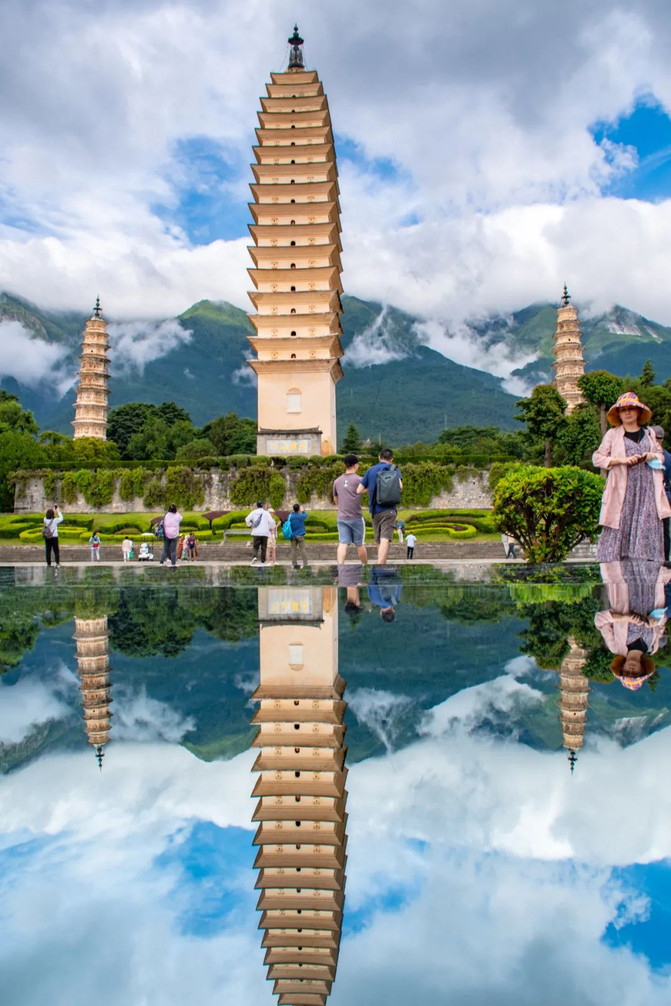 En este momento, la superficie del lago en el parque de reflexión es como un espejo enorme, copiando los detalles de las tres torres, la montaña Cang, el pabellón de ocho ángulos, el cielo azul y el paisaje alrededor del lago, formando una combinación de realidad y realidad, como un paisaje de la mañana ilusorio.