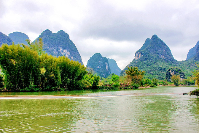 En el río Longhe, es el afluente más largo del río Lijiang en Yangshuo. Los picos a ambos lados son hermosos y ondulantes. El agua del río es clara como un espejo. Puede tomar fotos pintorescas de paisajes a mano. En comparación con el paisaje del río Lijiang, el paisaje del río Yulong es más suave, conocido como "Pequeño río Lijiang". El río Yulong es un hermoso río, que es famoso en todo el mundo por sus paisajes azules y puentes azules de bambú y bambú, que es un paisaje único en Guilin.