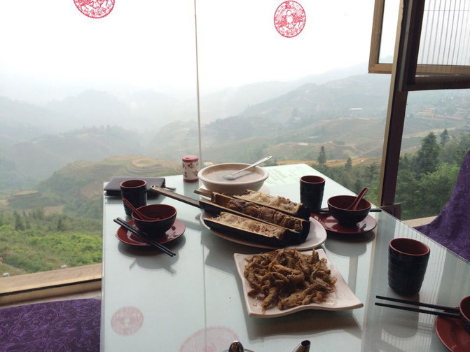 D1 llegó al aeropuerto de Liangjiang desde Shanghai por la noche. Debido al contacto con Xiao Chen por adelantado, nos esperaba en el aeropuerto. Xiao Chen nos ayudó a hacer la ruta, por lo que tenía que organizar todo. Después de que el coche de negocios fue entregado al hotel en la ciudad, cenó y descansó. D2 Se levanta por la mañana, el aire de Guilin es muy fresco y merece ser una ciudad verde. Xiao Chen en la puerta del hotel ya está esperando, nos llevó a comer harina de arroz de Guilin en el callejón, después del desayuno, salimos a Longridge, escuchamos a Xiao Chen en el camino a Longridge son carreteras de montaña, el camino será relativamente lejano, las carreteras de montaña son peligrosas, por lo que Xiao Chen son conducir con cuidado, en el camino se encontró con fuertes lluvias, el limpiaparabrisas es más inútil. Después de dos horas y media, finalmente llegó a la taquilla de Longridge, y media hora para entrar en el pueblo de Dazhai, llegó al pie de la montaña. En el gran pueblo, a la derecha está el teleférico. Caminamos hasta la primera plataforma de observación y después de comer en una comida de granja al pie de la montaña, pedimos una sopa de chupa enchupa, que nos gustó especialmente el arroz de bambú. Después del almuerzo, comenzamos una caminata formal de montaña para perder peso, que tomó casi una hora de viaje hasta el edificio panorámico del hotel que pedimos, donde las casas están construidas de madera. El camino para subir la montaña es de escalones de pizarra, y cuanto más arriba, el paisaje será más espectacular. En el camino también verá a los lugareños vestidos con trajes antiguos, a veces le preguntará que necesita llevar algo, terrazas de la cresta del dragón, como una escalera de arriba hacia abajo, particularmente hermoso, el campo todavía tiene la lluvia y la niebla alrededor de Yao. Después de una hora, finalmente llegamos al hotel, que se encuentra en el punto más alto de Dragon Ridge. Después del check-in, Xiao Chen nos sugirió que tomáramos una siesta y un baño. Cena a las 6: 30 de la noche. Disfrute de la vista y tome fotos en el hotel. A las 6: 30 p.m., Xiao Chen nos ayudó a reservar una comida, hongos de árbol de té, pollo de tubo de bambú, arroz de tubo de bambú y vegetales locales. La vista del restaurante es muy buena y se puede disfrutar de la vista mientras se come y beber una taza de vino local, agrio y dulce.