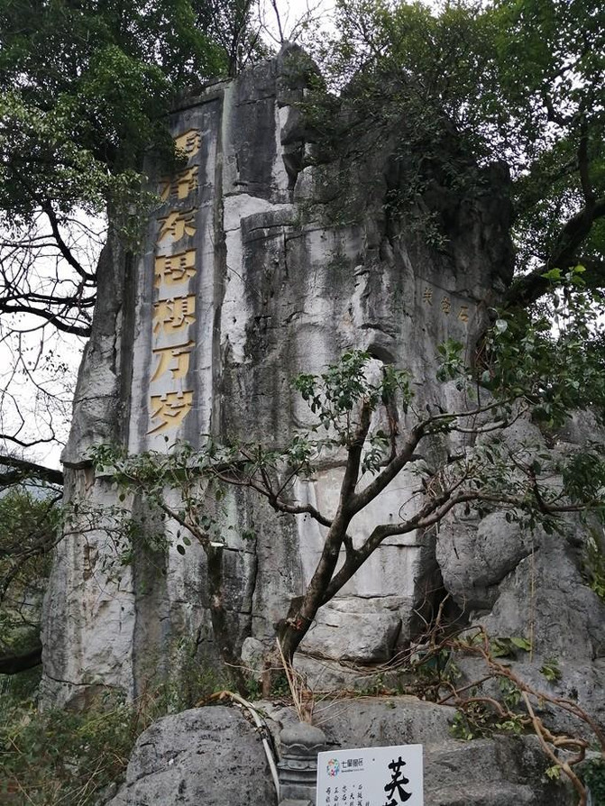 Al lado del puente de flores, hay una montaña más pequeña de Guilin, esta montaña también se llama piedra de hibisco, es una gran piedra, piedra de unos 10 metros de altura, esta piedra se erige como una columna, por lo que también tiene el nombre de "pilar del cielo". Frente al puente de flores, hay siete grandes caracteres tallados con "Viva el pensamiento de Mao Zedong", y hay árboles en la piedra, sus raíces casi cubren toda la montaña. Debido a que está en reparación, no puedo entrar y echar un vistazo a algunas de las tallas de piedra en arriba.