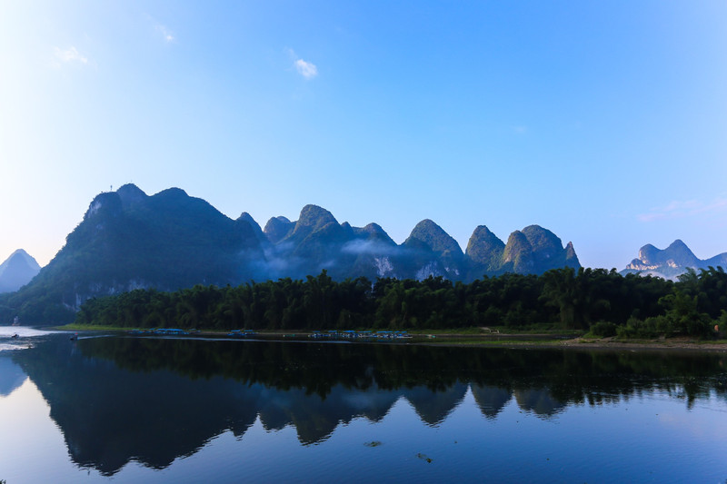 Los picos y montañas, el agua azul como un espejo, las montañas verdes y el agua flotante, el reflejo, el paisaje a ambos lados del río Lijiang es como una galería de cien millas, las montañas lejanas bajo la luz del sol, cubiertas con un abrigo verde, parecen particularmente hermosas. Las montañas y los ríos, las montañas y el agua se mezclan, dejan que la combinación de la agilidad y la calma, dejan que el sabio y el benevolente se complementen mutuamente. Las montañas se conectan con las montañas y el agua se conecta con el agua, que es hermosa y espectacular.