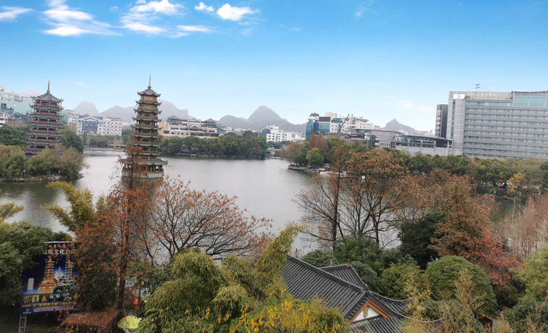 Todas las habitaciones utilizan grandes ventanas de cristal, hacen que las habitaciones del hotel sean más abiertas, a través del vidrio, de pie en la terraza con vista al río se puede ver el sol y la luna de las torres gemelas, la vista de la montaña, la vista de los dos ríos y cuatro lagos de la hermosa vista. La excelente ubicación y el hermoso paisaje son una de las razones por las que este hotel se convierte en un hotel imperdible en Guilin en 2020.