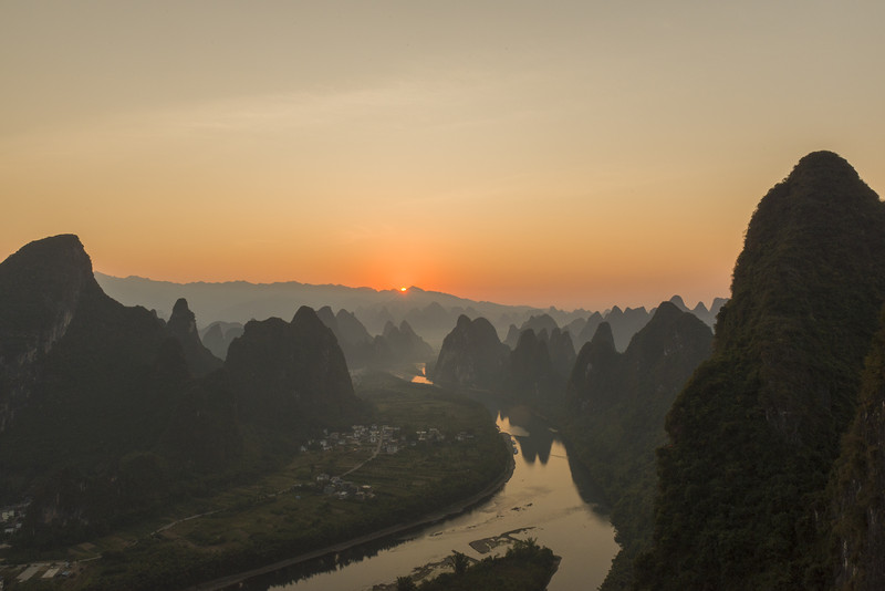 La montaña mencionada anteriormente, que permite a las personas estar de pie en lo alto con vistas a la gran curva del río Yangtze, se llama Xianggong Mountain, que contrata el amanecer más hermoso de Guilin. Cada amanecer, la plataforma de observación en la montaña se llena de fotógrafos y turistas. La gente mira hacia la curva de casi 360 grados y ve el cielo mostrando lentamente un rayo de amanecer. La luna y las estrellas se desvanecen lentamente en el amanecer gradualmente claro. El sol rodante emerge de repente de los picos de las montañas extendidas, y luego en cuestión de minutos ilumina todo el cielo y la tierra. En este momento, la multitud, sin excepción, se sorprenderá. Si has visto el amanecer en la montaña Sanggong, Encontrarás que el amanecer del mundo parece eclipsado por ella.