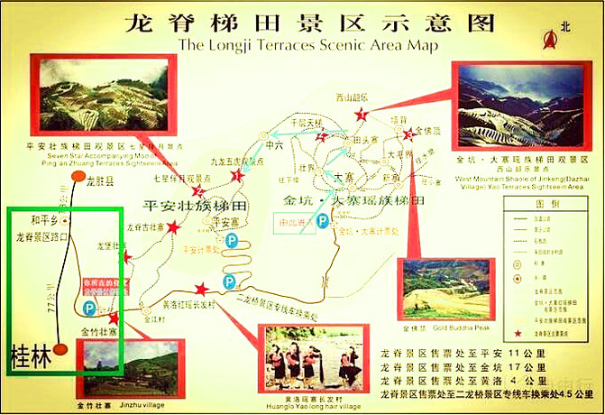 Habla de Dragon Ridge Terraces. En el municipio de Heping, sureste del condado de Longsheng, Guangxi, hay un gran grupo de terrazas, que se distribuye entre 300 y 1100 metros sobre el nivel del mar, con una pendiente máxima de 50 grados. La terraza se enrolla desde el pie de la montaña hasta la cima de la montaña, capas sobre capas, escalonadas, sus líneas son nubes y agua corriente, su escala es majestuosa y espectacular, conocida como "terraza de cresta del dragón".