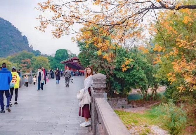 Es justo a finales del otoño, los árboles a ambos lados son verdes esmeraldes con amarillo, todo tipo de árboles preciosos en el parque es un hermoso paisaje, pasear por el parque, por no mencionar que hay más sentimientos. En el camino, ocasionalmente, los monos vienen a interactuar con los visitantes, ¡particularmente interesante! Lo que más me impresionó fue la montaña de camellos, una de las montañas famosas de Guilin en el parque. Se encuentra en el parque de siete estrellas de Guilin. Se dice que el ex presidente de los Estados Unidos, Bill Clinton, también visitó aquí y dejó una foto de grupo.