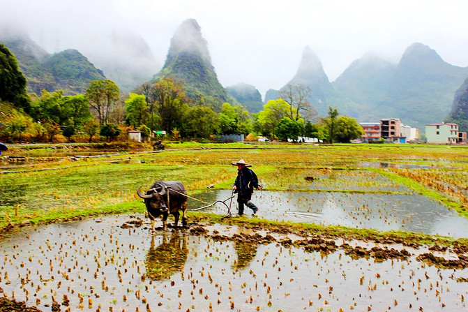 Las lluvias de primavera continúan en marzo, y es una temporada ocupada de arado de primavera. Al entrar en la aldea de Sitang Tianxin, distrito de Lingui, Guilin, Guangxi, sin el ruido y el rugido de los tractores, todavía mantiene el estilo de vida agrícola tradicional de los búfalos cultivando campos. Los paisajes únicos dejan una profunda impresión, entre ellos el puente Zhuangyuan es el paisaje representativo de la aldea de Tianxin. Cada vez que las flores cálidas de primavera florecen, los amantes de la fotografía de todo el país se reúnen aquí antes y después de la labranza de Qingming. Hermosas montañas y ríos, extensos campos pastorales, constituyen aquí un cuadro maravilloso.