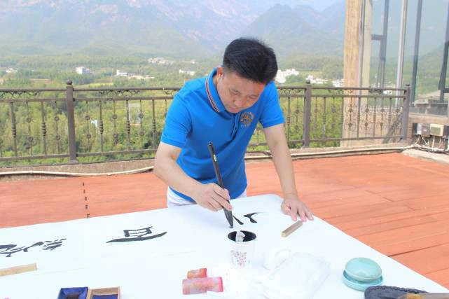 Chiang Zhiwen, miembro de la Asociación de Caligrafía de Guangxi y calígrafo, está creando bajo la montaña Cat 'er