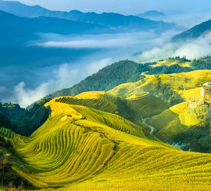 El otoño de las terrazas de Longridge está destinado a asombrar al mundo entero. Desde el pie de la montaña hasta la cima de la montaña, las capas se superponen y se dispersan. En un instante, parece irrumpiendo en un pequeño mundo de flores de melocotón.