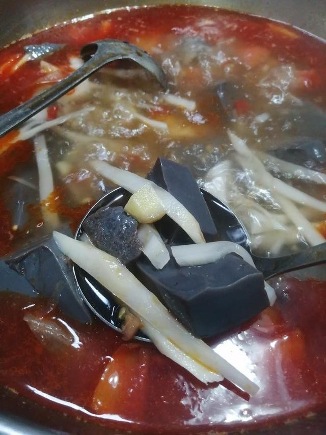 Comiendo, no he entendido el fondo de la olla es tofu negro o sangre de vaca, ahora quiero venir, debe ser konjac