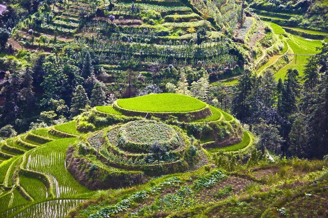 Las terrazas se distribuyen entre 300 y 1100 metros sobre el nivel del mar, con pendientes en su mayoría entre 26 y 35 grados, con una pendiente máxima de 50 grados. Desde el pie de la montaña hasta la cima de la montaña, las colinas son como caracoles, las montañas son como torres, capas sobre capas, altas y bajas. Mirado desde lo alto, las hermosas curvas de las terrazas son paralelas o cruzadas, sinuosas como caracoles de primavera y torres de nubes, lo que muestra la hermosa belleza de las curvas. Sus líneas fluyen en nubes, elegante y suave; su escala es magnífica y magnífica, y tiene la reputación de "la corona del mundo de terrazas".