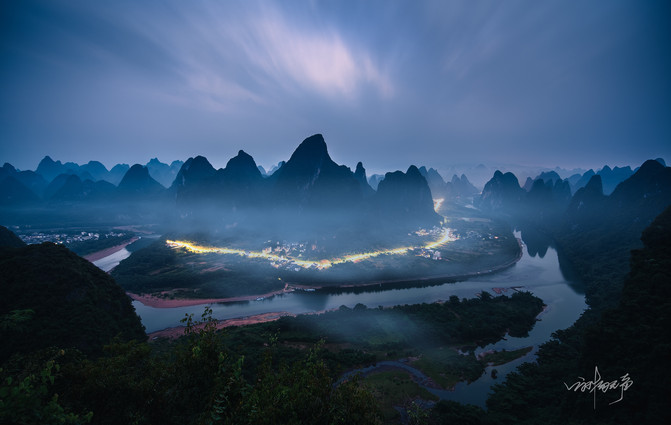La montaña Xianggong se encuentra en la orilla oeste del río Lijiang en la ciudad de Xingping, entre Huangbu Beach y Jiuma Painting Mountain, a unos 28 km de Yangshuo. Al subir a la montaña Xianggong, mira a lo lejos, la visión es vasta, pero ve los picos cársticos en capas, altos y bajos, dispuestos en orden, tienen una especie de fuerza de miles de caballos galopando, el río Li claro serpentea en los brazos de las montañas. La luz y las sombras, el mar de nubes, el amanecer y las nubes han atraído a innumerables fotógrafos y amantes de la fotografía.