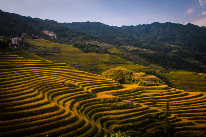 El otoño dorado, volvemos a la terraza de Jinkeng y la terraza de Heping 'an en Longji, Guilin, que forman un marcado contraste con la primavera. Aquí ya es la temporada madura y la temporada de cosecha. Algunas terrazas aquí son curvas y aerodinámicas, algunas parecen subir en espiral, algunas parecen cabello largo rizado y volante de una niña, algunas como peinadas de cabello elaboradas en la antigüedad. Veemos las surgidas y bajas plántulas de trigo verde pálido, capas de gansos amarillos, algunas de las espigas de trigo ligeramente rojas bajo la luz del brillo, y está acompañado por él. Una inexplicable sensación de felicidad se genera en el corazón. En estos años, no importa qué vientos y lluvias hemos pasado juntos, los días más amargos también nos enfrentamos juntos, gracias a Dios por la atención, nos permite sentarnos en una silla de mecedora juntos lentamente con el tiempo.