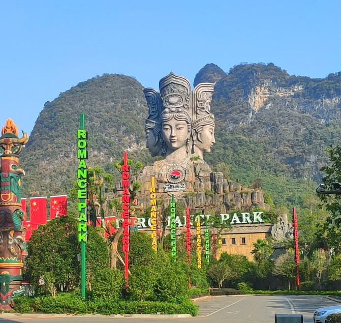 La puerta del lugar escénico que todos miran hacia arriba es la estatua de cantores más grande del mundo. La estatua es vívida y se integra con el paisaje de Guilin. Es la encarnación de los hijos verdaderos y hermosos de la tierra de Guilin. Hay un pájaro divino en cada lado de la estatua, lo que significa que las canciones de los inmortales todavía se extienden por todas partes, ecoando entre las montañas verdes y las aguas verdes.