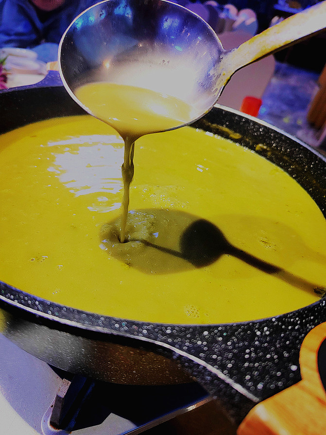 Un año vi las flores de melocotón en un lugar en el norte de Guangxi. Cuando salí de compras por la mañana, llovió. Una anciana en cuclillas en el lado de la carretera jugó té de aceite, junto con un montón de ajo y jengibre, y el té de aceite en la pequeña olla ya estaba cocido. Una olla de té de aceite verde tenía pequeñas burbujas. Tan tentador que no dijo nada, apresurado a un tazón.