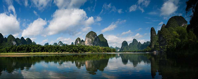 El agua de Guilin es como un cinturón de jade sinuoso, enredado en picos exuberantes. Al igual que un gran espejo incrustado en las montañas, navegando en bote en el río Lijiang, es impresionante el reflejo de picos extraños, aguas azules y montañas verdes. El lago y las montañas, a los ojos, hacen que el corazón se relaje y se olvide de regresar. Los niños pastores cantaron, los pescadores ociosos, las familias idílicas, el aliento fresco, todo era tan poético y pintoresco. Caminando por el lago, ondulando en el lago, palmeras cantando, flores acantilados, algas, cabellos claros, viejos vientos altos y otras escenas gradualmente en la vista, estar en él, acompañado de una sensación fresca y elegante, cómodo y tranquilo, en todas partes no reflejan el reino perfecto de "la unidad del mundo y el hombre".