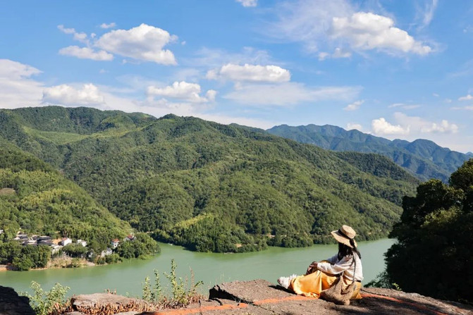 Continúe subiendo a lo largo del camino de montaña, más de diez minutos hasta la cima de la montaña puede ver el enfrentamiento de Qifeng, mirando hacia fuera, el río Fuchun es verde esmeralda como un rollo de pintura, el paisaje es hermoso a la afasia.