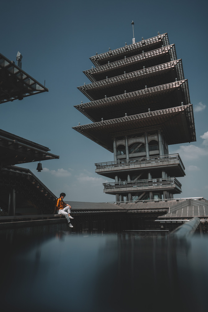 Después de llegar a la cima de la montaña, finalmente vio el tan esperado pavilón Donglai, incluso cuando el sol del mediodía se dispara, también es muy "fantasma de hadas". Aunque Donglai Pavilion tiene la apariencia de un edificio antiguo, es un edificio de estructura de acero puro. La textura metálica es muy fuerte bajo el sol. De pie en el antiguo edificio de estructura metálica, habrá un poco de caos en el tiempo y el espacio. El estilo de diseño vanguardista de Donglai Pavilion, al igual que mi impresión de la ciudad de Hangzhou, incluye la modernidad y la tradición, la vanguardia y la simplicidad, lo que demuestra una actitud fría de liberación e inclusión.
