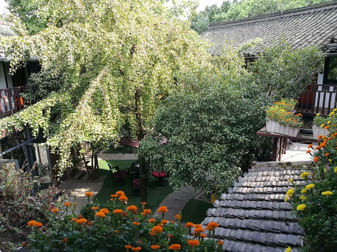 Tomamos el autobús de vuelta al hotel, era temprano y nos sentamos en el pasillo fuera de nuestra habitación para descansar. Hay muchas mesas y sillas en el pasillo y el patio, al principio no entiendo cómo poner tantas mesas y sillas afuera, ahora finalmente me doy cuenta. El diseño del hotel es elegante y sencillo, dos pisos de edificios antiguos de madera de colores antiguos, rodeados por un pequeño patio, hay un exuberante árbol de ginkgo en el centro del patio. El débil sol de la tarde de otoño, inclinado en el patio, hace que la gente se sienta perezosa, solo quiere sentarse y disfrutar de este momento de tranquilidad.