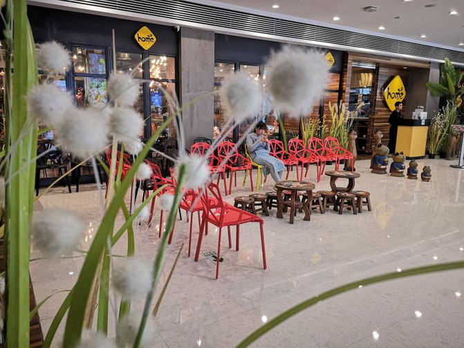Los asientos son principalmente mesas para cuatro personas, y también hay asientos de sofá.