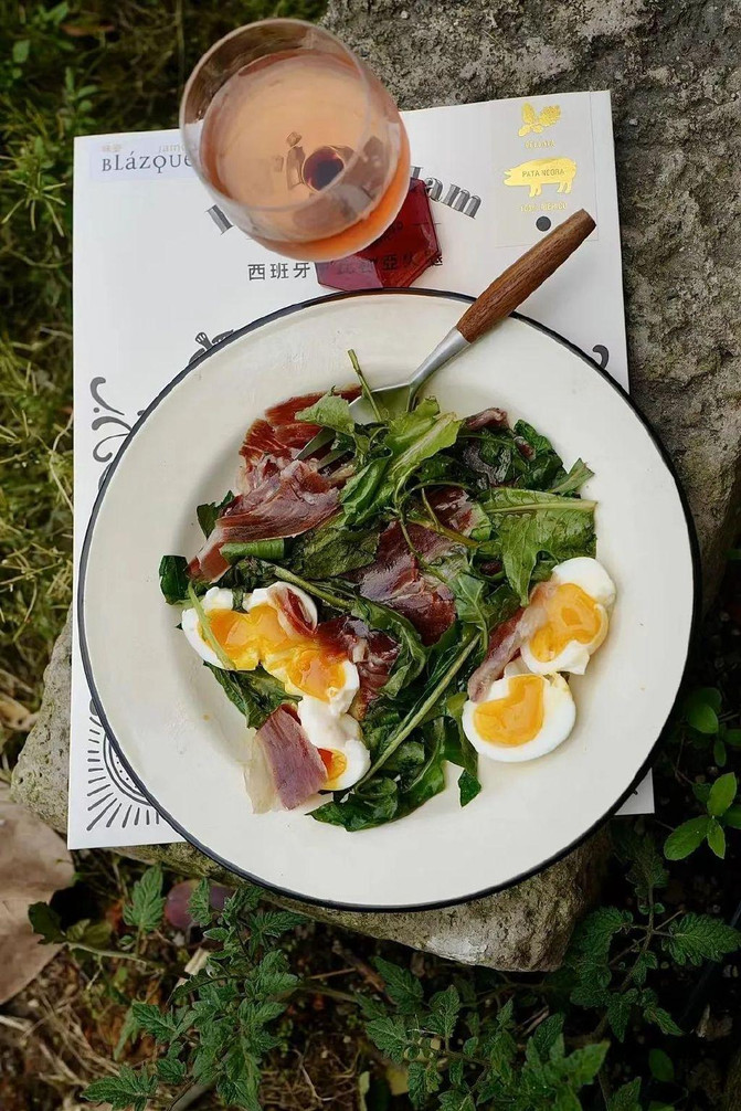 Para el almuerzo, un plato de jamón de cerdo negro 5J en el bosque de roble español, un pequeño sorbo de sopa de sopa de rosmarín, de repente tiene una pequeña certeza de principios de primavera.