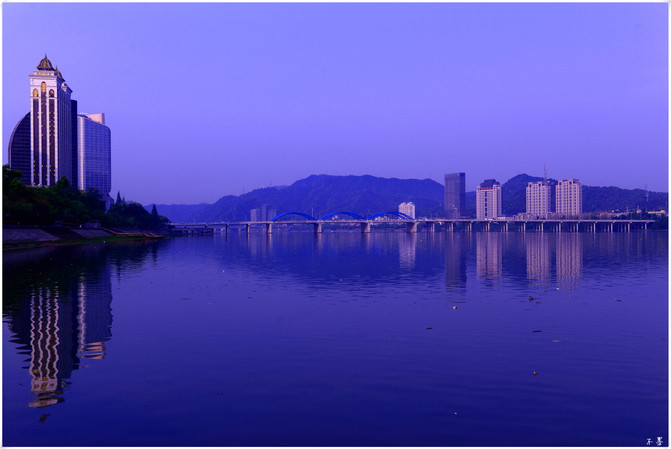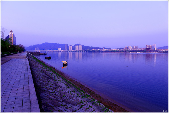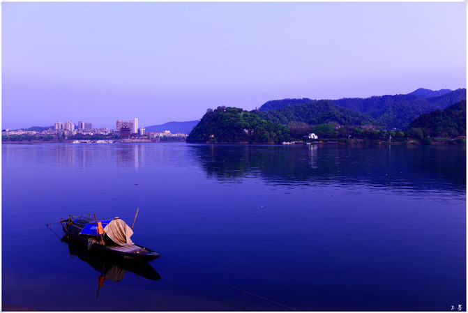 Temprano en la mañana, el río es ancho y tranquilo, el bote está quieto, el río es claro y claro, las montañas y la ciudad parecen haberse despertado de su sueño, todo parece tranquilo y cómodo.