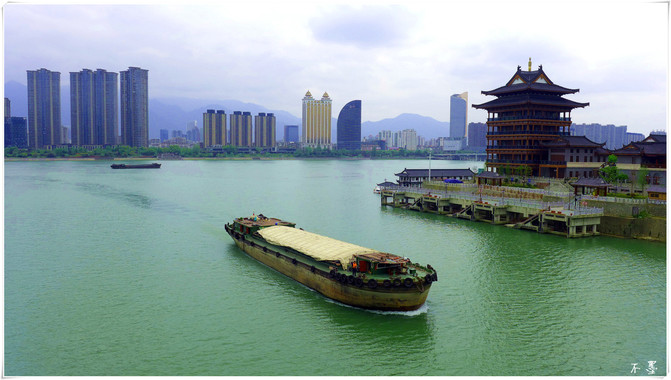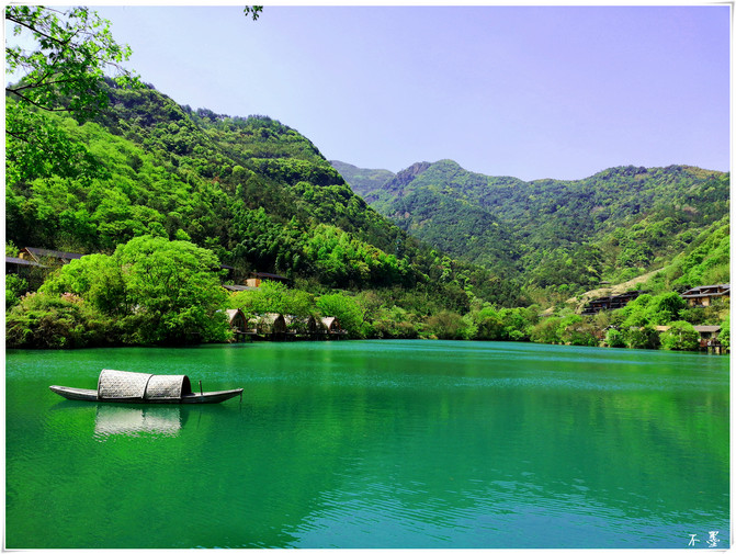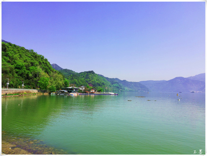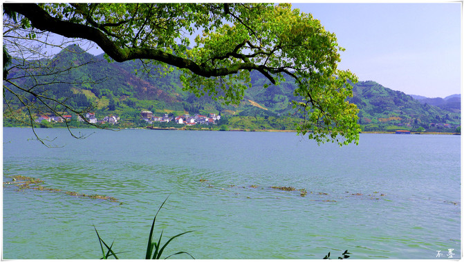La montaña Tongjun en la orilla opuesta está llena de verde, la torre en la cima de la montaña es escasa, la casa está aislada al pie de la montaña, junto con la montaña y el agua, los barcos en el muelle están ordenadamente dispuestos para dar la bienvenida a los huéspedes.